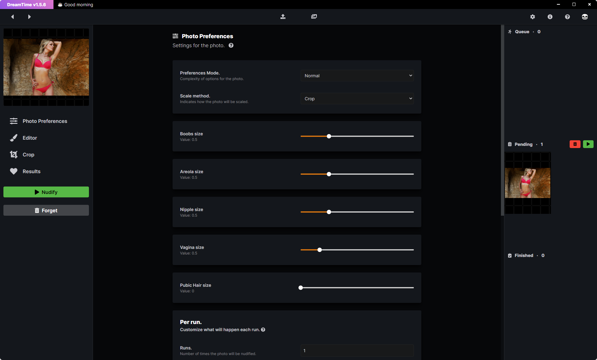 For example, if you set that you want 5 runs with random preferences you will get 5 fake nudes from the same photo with different sized tits, nipples, etc. In the body preferences you can set additional options such as disabling randomness in certain body parts or the randomness range.