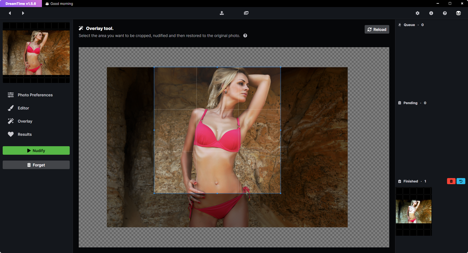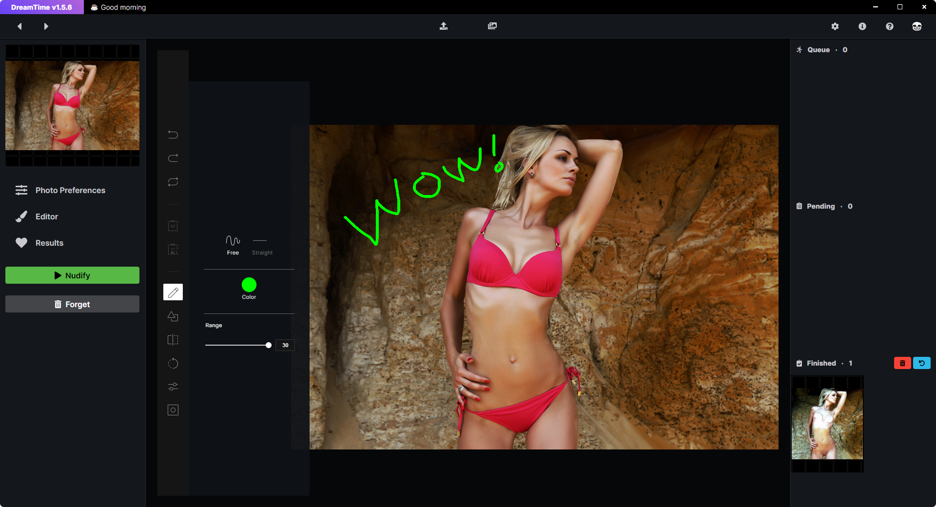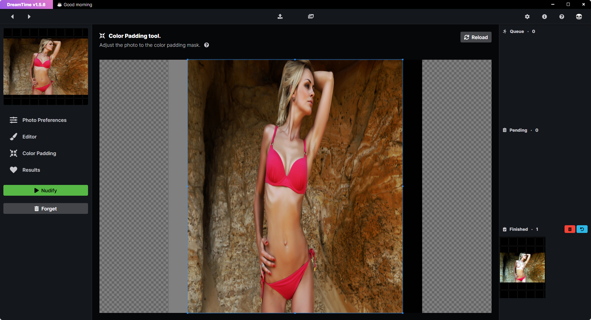 - Color transfer: Uses an experimental algorithm that tries to transfer the colors of the original photo to the fake nude. (A good result is not always achieved)